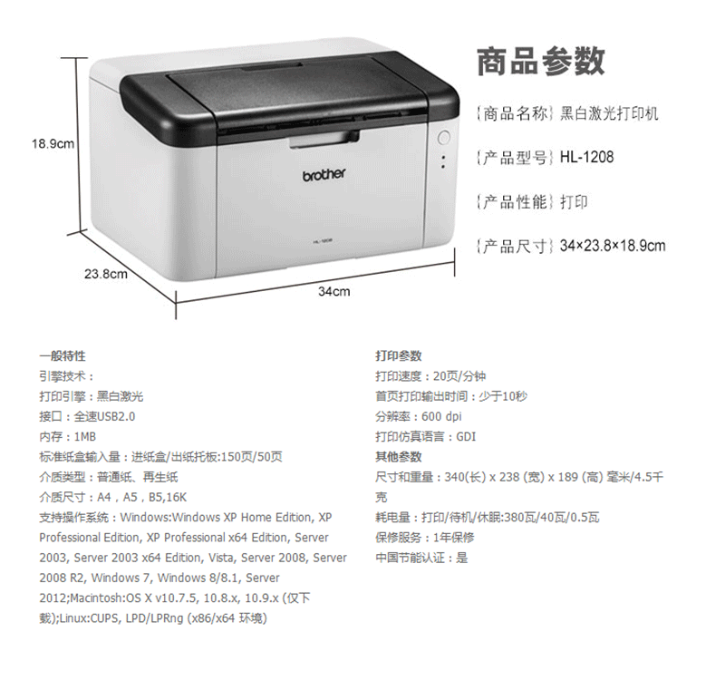 兄弟(brother) HL-1208 黑白激光打印機