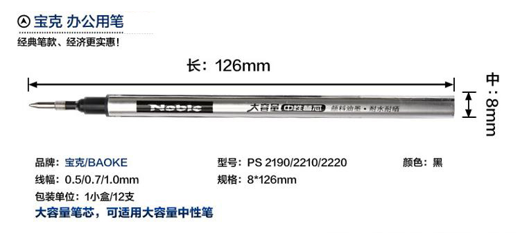 寶克(BAOKE)黑色大容量中性筆筆芯 PS2210/12支裝(0.7mm筆芯)