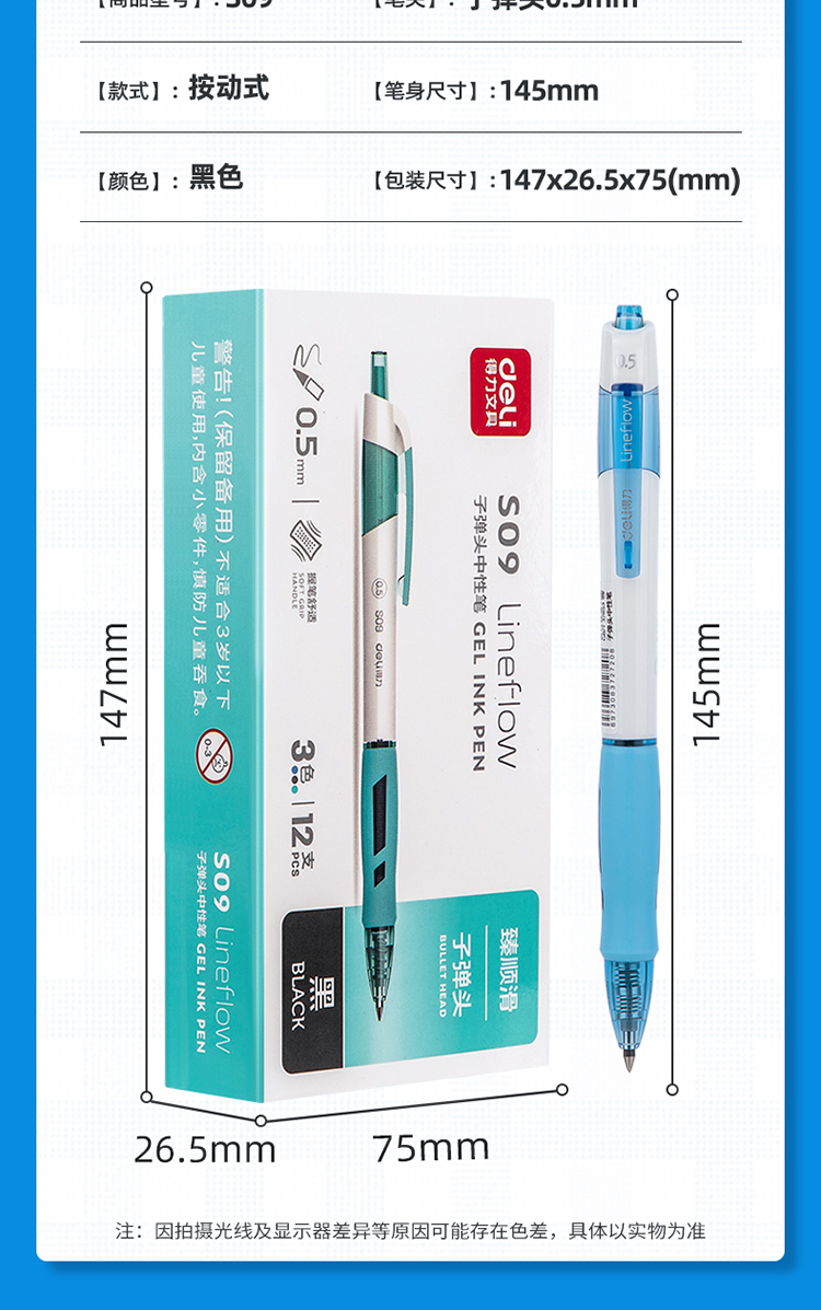 得力(deli)S09 按動(dòng)子彈頭中性筆 黑色簽字筆 0.5mm 12支/盒
