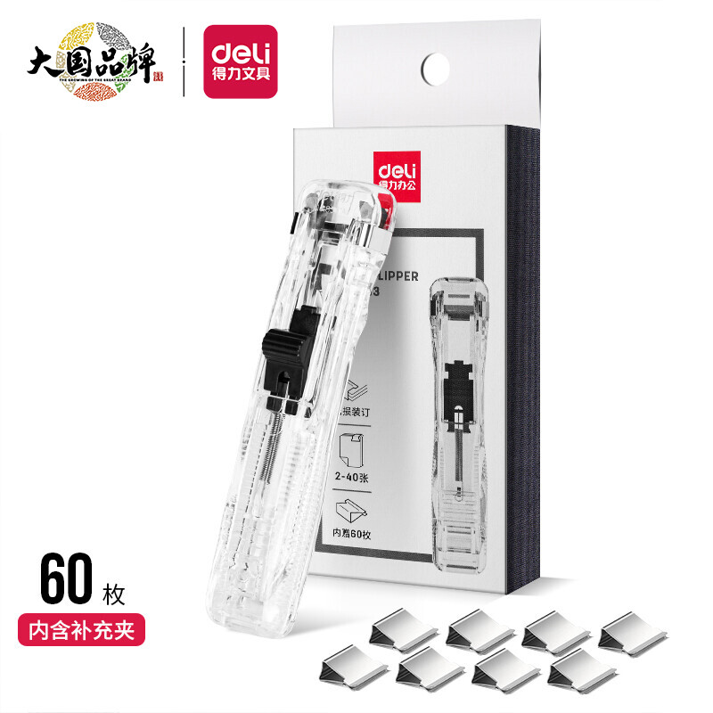 得力(deli)辦公裝訂推夾器套裝(推夾器+60枚補充夾) 可夾紙張數(shù)40張 透明白33183
